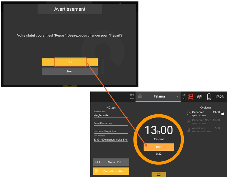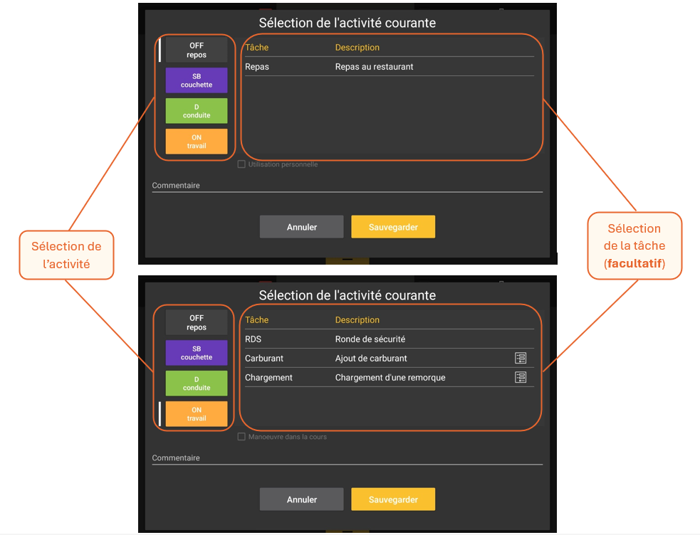 La sélection d’une activité du DCE (dispositif de consignation électronique) se fait de la façon conventionnelle dans la section gauche de l’écran. Si le conducteur le désire (facultatif), il peut aussi choisir une tâche en lien avec cette activité en appuyant sur la ligne correspondante. La tâche peut être désélectionné en appuyant de nouveau sur la ligne.