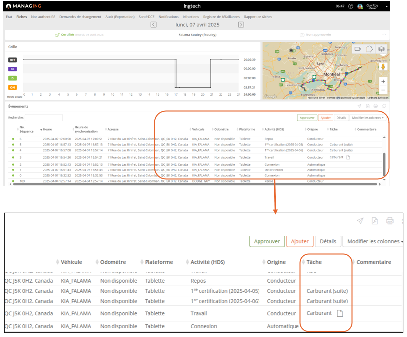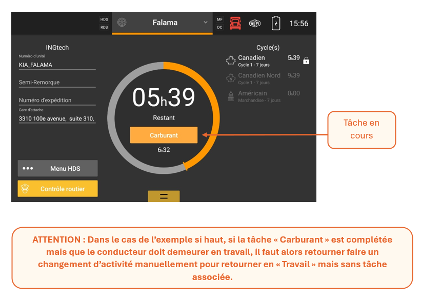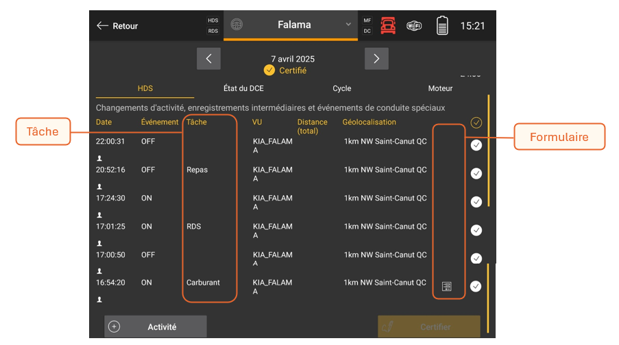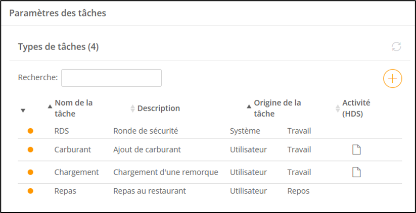 Les tâches sont des attributs complémentaires qu’il est possible d’associer à des activités légales HDS (Heures de service). Ces tâches permettent alors de fournir de l’information additionnelle qui n’est pas requise nécessairement du point de vue légal mais qui a une valeur ajoutée pour l’exploitant par l’entremise ou non d’un formulaire associé.