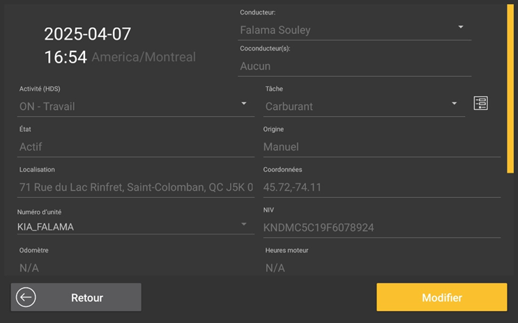 Si un administrateur fait des changements aux tâches ou aux formulaires, ceux-ci seront visibles suivant une déconnexion et une reconnexion du conducteur.