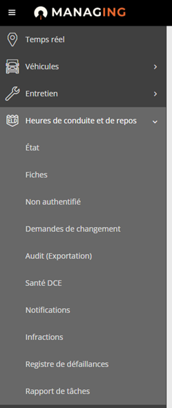 Le rapport de tâches est accessible via le menu des « Heures de conduite et de repos » sous l’onglet « Rapport de tâches »