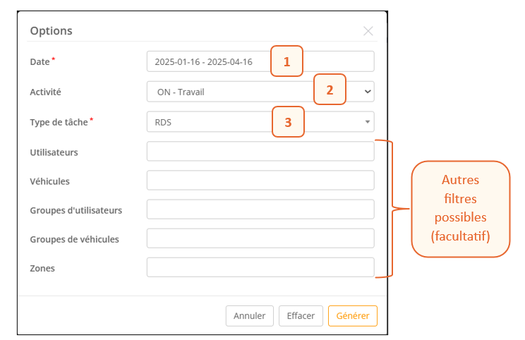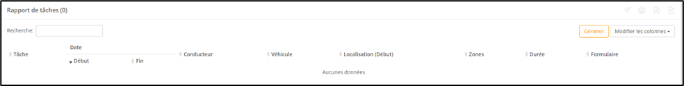 - À partir de l’onglet des « Rapport de tâches » dans le menu « Heures de conduite et de repos » (voir section détaillée « Rapport de tâches »)