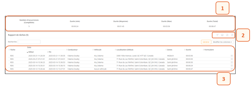 - Détails de chacune des tâches correspondant aux critères de recherche incluant la possibilité de cliquer sur l’icône d’un formulaire pour le visualiser