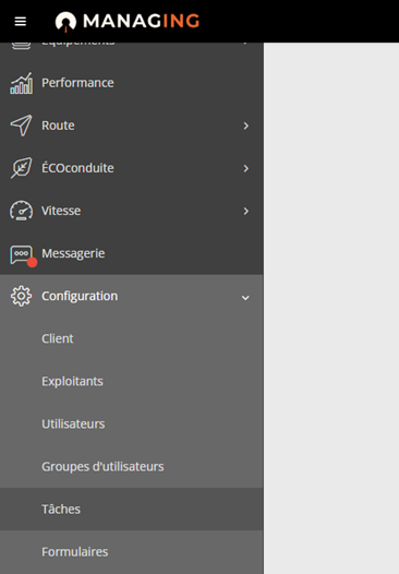 La gestion des tâches et des formulaires se fait via le menu « Configuration ».