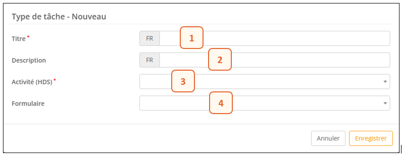 En appuyant sur le bouton « Sauvegarder », si un formulaire est associé à la tâche sélectionnée, il apparaitra. Il faut le remplir et ensuite appuyer sur « Sauvegarder ». Les champs suivis d’un astérisque sont obligatoires.