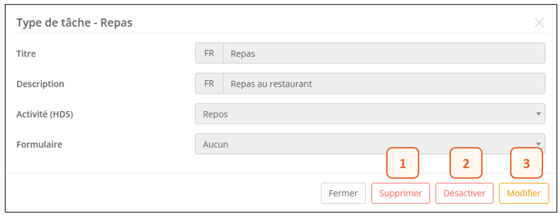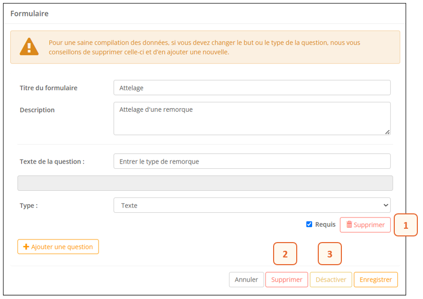 Il est possible en tout temps d’accéder au détail d’un formulaire en appuyant sur la ligne correspondante pour le modifier ou encore le désactiver. Si l’option de modification est choisie, il y aura alors la possibilité de le supprimer.