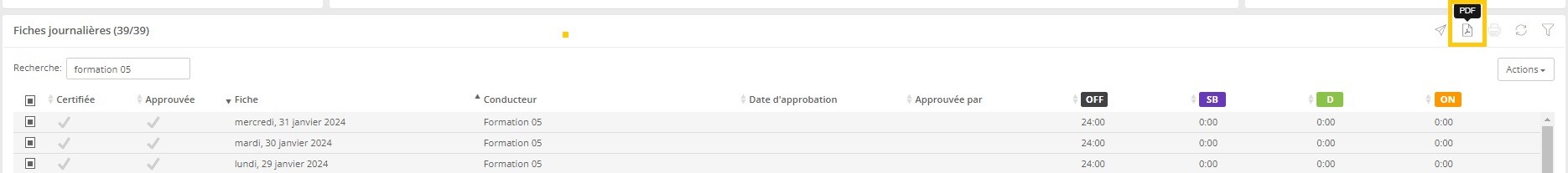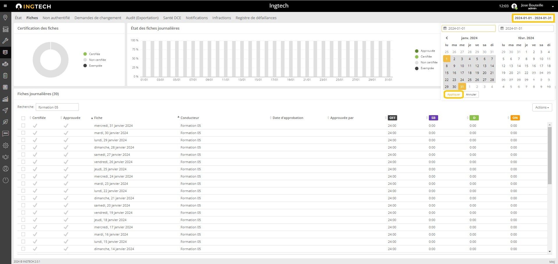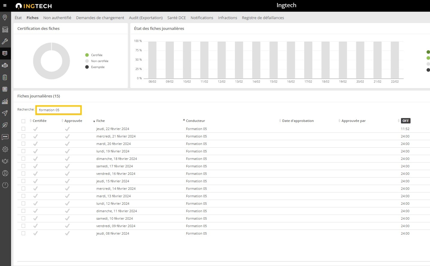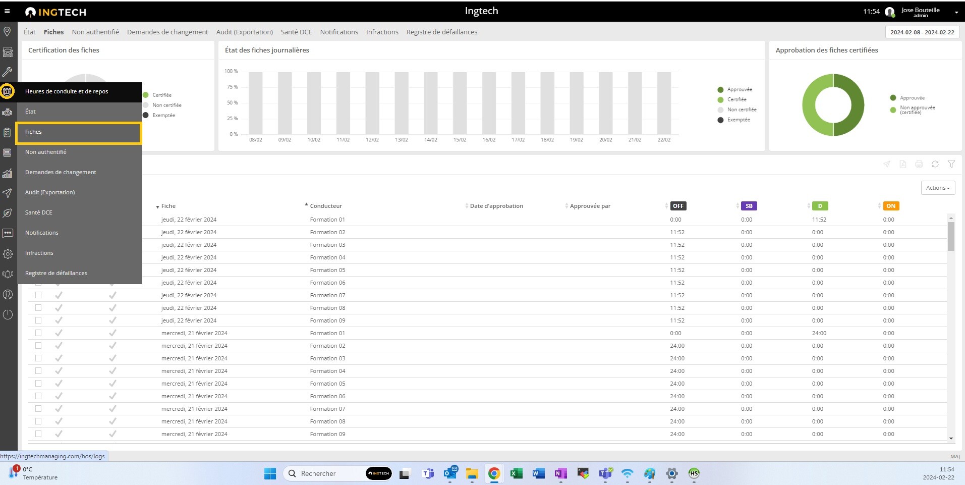 1. S'identifier à l'application web managING ( www.ingtechmanaging.com ) avec un compte de type Admin puis naviguer à la page fiches sous l'onglet Heures de conduite et de repo .