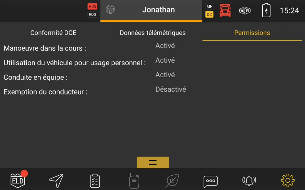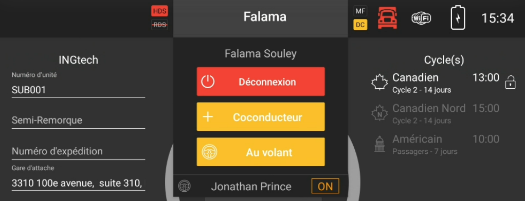 Appuyer sur le prénom de l'utilisateur en cours et sélectionner Au Volant . Dans la boîte de dialogue, sélectionner le conducteur auquel on veut attitrer le rôle de conducteur au volant. Toutes les activitées du DCE seront maintenant consignées sur son profile. L'icôneindique qui est le conducteur au volant.
