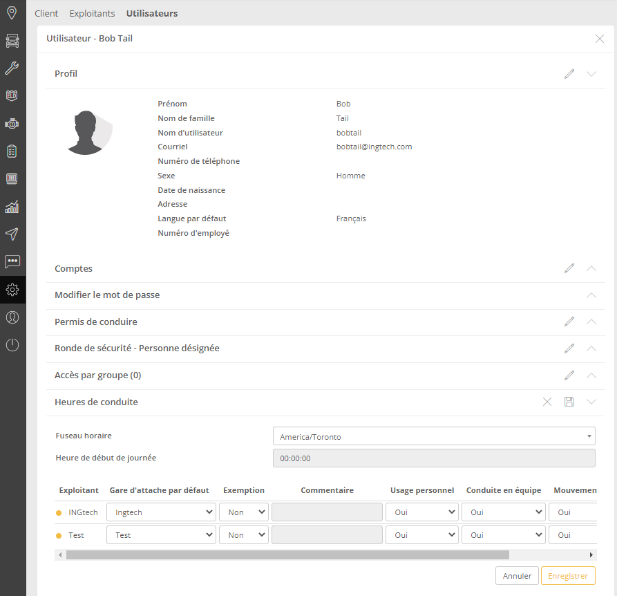 2. Sélectionner le profil du compte conducteur auquel ajouter la permission de conduite en équipe. Sous l'onglet Heures de conduite, activer la modification avec le boutonet modifier le champ Conduite en équipe pour indiquer Oui sous l'exploitant désiré. Puis Enregistrer.