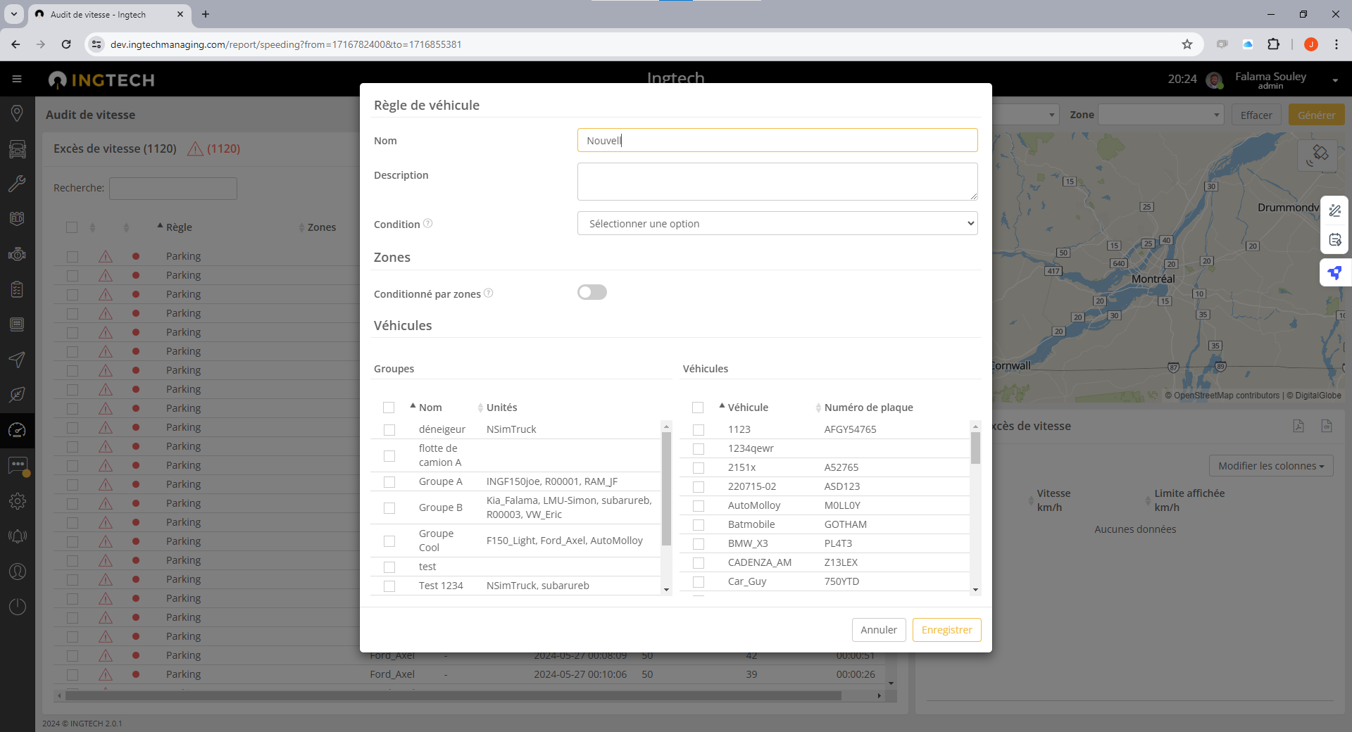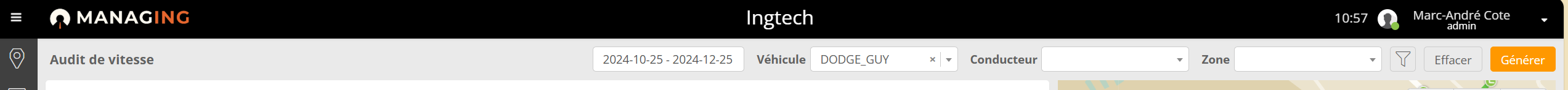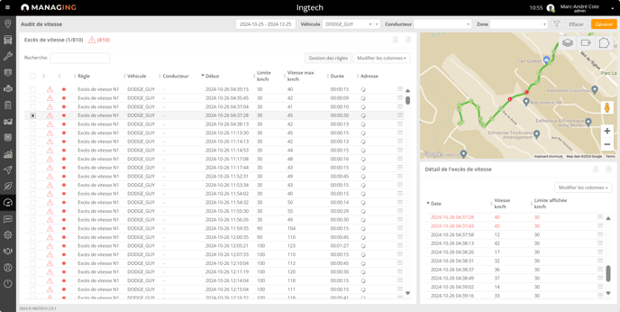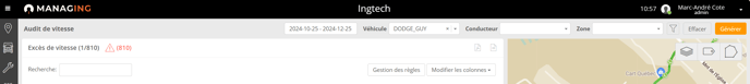 L'outil d'audit de vitesse permet aux exploitants de surveiller les incidents d'excès de vitesse en fonction de vitesses fixes et/ou des limites affichées. De plus, il permet d'assurer la validation de ces incidents par un administrateassure tout en offrant la possibilité de filtrer les recherches par zones, véhicules et conducteurs spécifiques.
