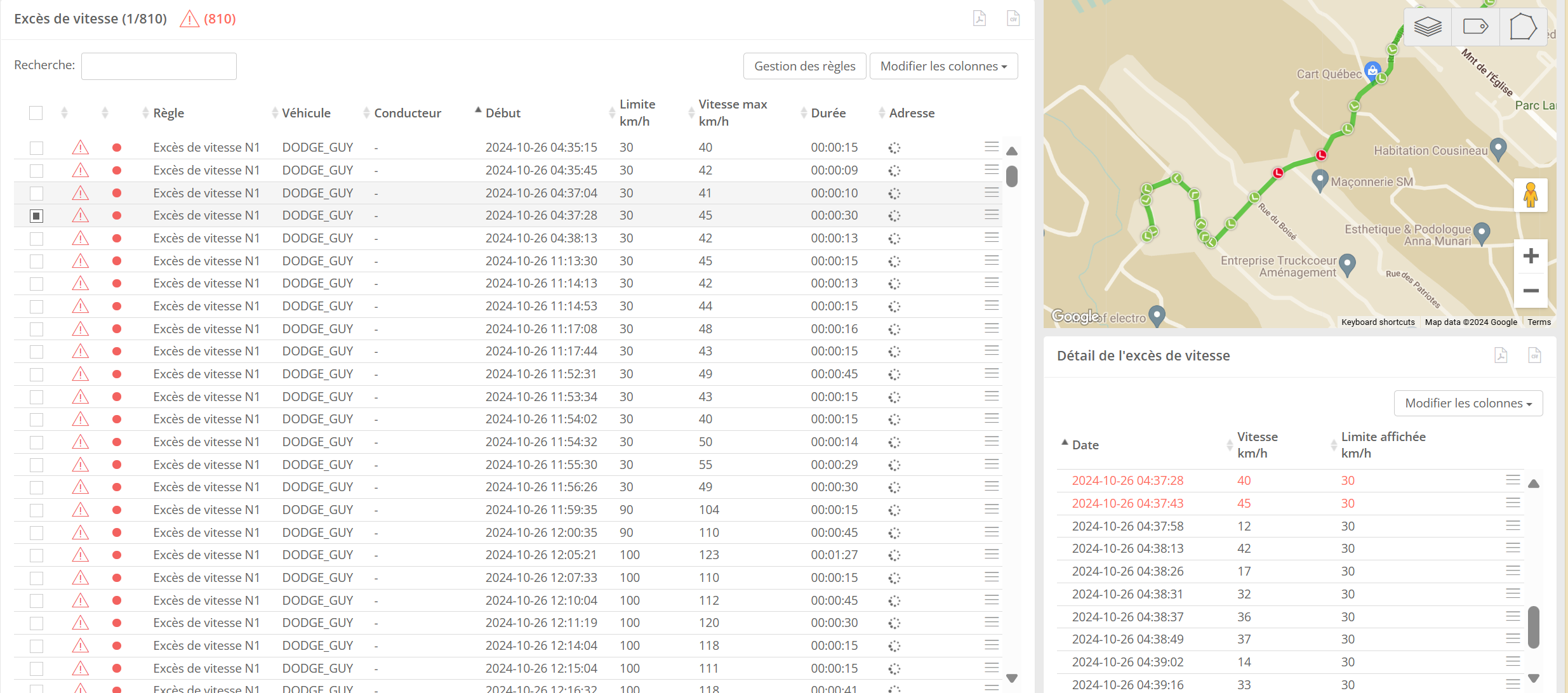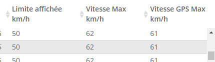 - Consulter la section « Compréhension d’un rapport d’évènements d’excès de vitesse » pour maitriser ce tableau.