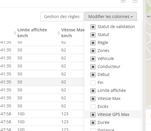 - Comme pour le tableau des « Excès de vitesse », les colonnes affichées peuvent être changées et le tableau peut être exporté en pdf ou csv.