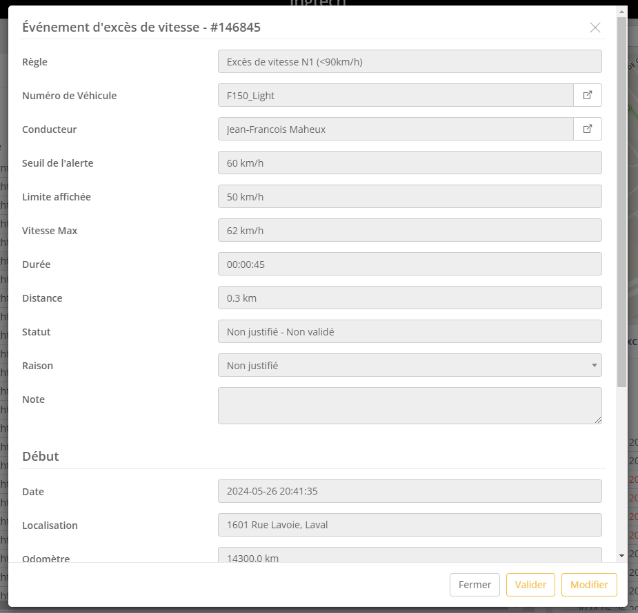 K - Diverses informations tel que la règles d’excès de vitesse qui s’applique, le véhicule, le conducteur, la date et heure du début et de fin, la limite de vitesse affichée, la vitesse maximale atteinte, la vitesse GPS maximale, la durée, la distance parcourue et les notes associées à l’excès de vitesse.