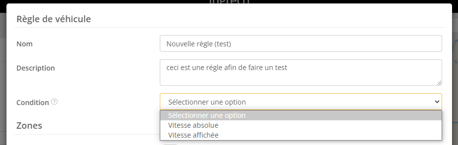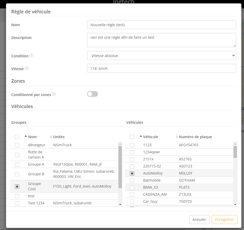 - Sélectionnez, les zones et les véhicules auxquels s’appliquent cette règle.