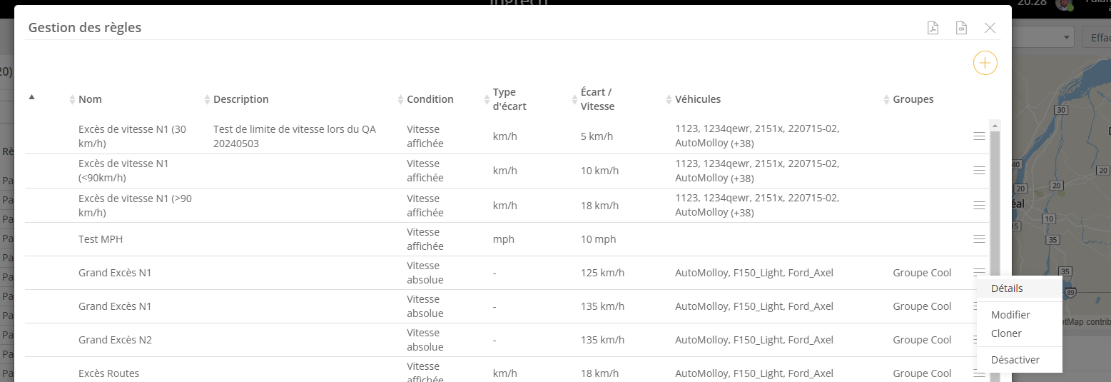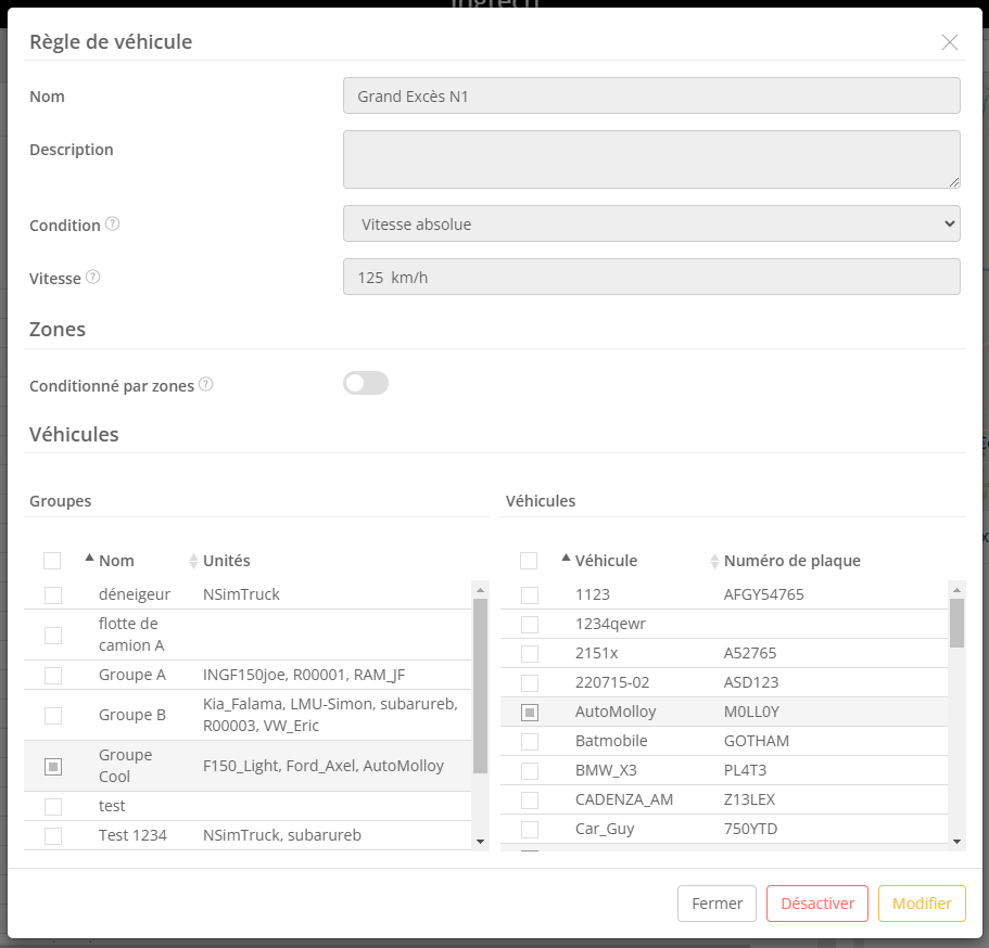 IMPORTANT : modifier une règle peut entraîner des variations dans les évènements d’excès de vitesse en fonction de la date d’entrée en vigueur des changements effectués. Soyez conscient de l’impact de vos modifications.