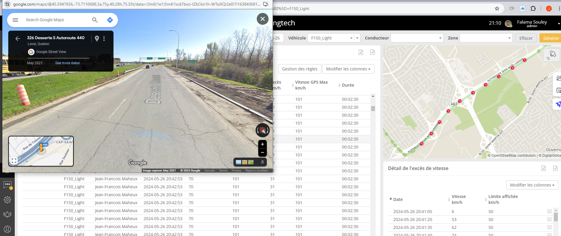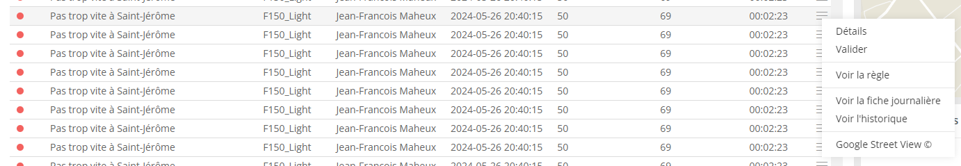 - Consulter, via une fenêtre externe, la position du début de l’excès de vitesse via l’outil de Google Street View afin de contrevérifier le lieu et/ou la vitesse affichée. Notez que l’information présentée peut datée et que nous ne sommes pas responsable du contenu proposé par Google Street View.