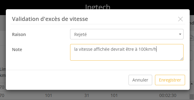 - Rejeté : L’excès de vitesse est considéré non valide. Un commentaire sera obligatoirement requis pour être enregistré.