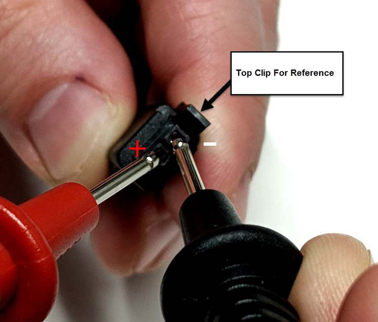 - Avec l'alimentation fournie au câble d'alimentation, vérifiez la broche inférieure positive et la broche supérieure négative sur le câble d'alimentation avec un multimètre. (Voir Figure suivante)
