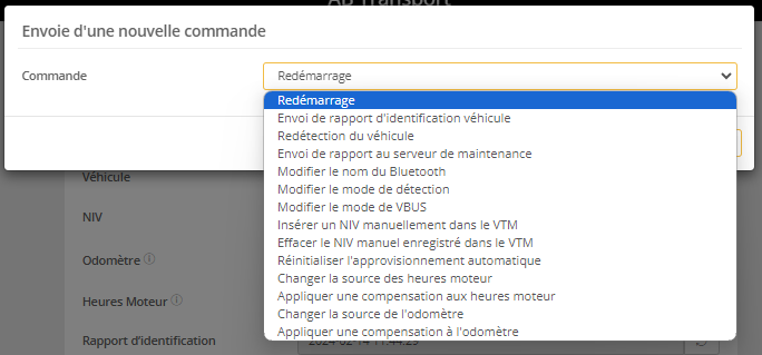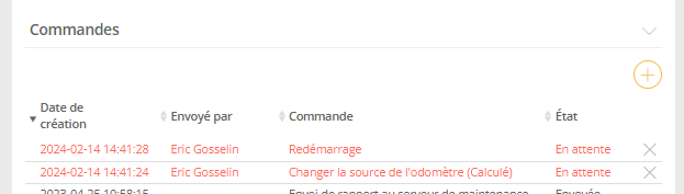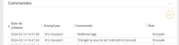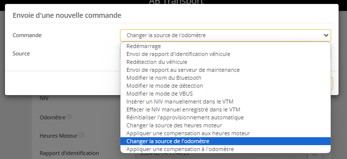 Modifier la source d'odomètre ou d'heures moteur- Sous l'onglet Commandes, sélectionner le (+) et envoyer la commande Changer la source des heures moteur ou Changer la source d'odomètre.