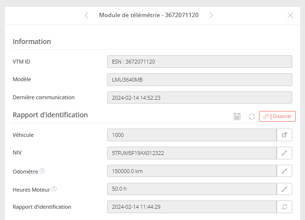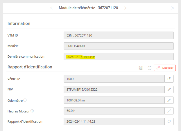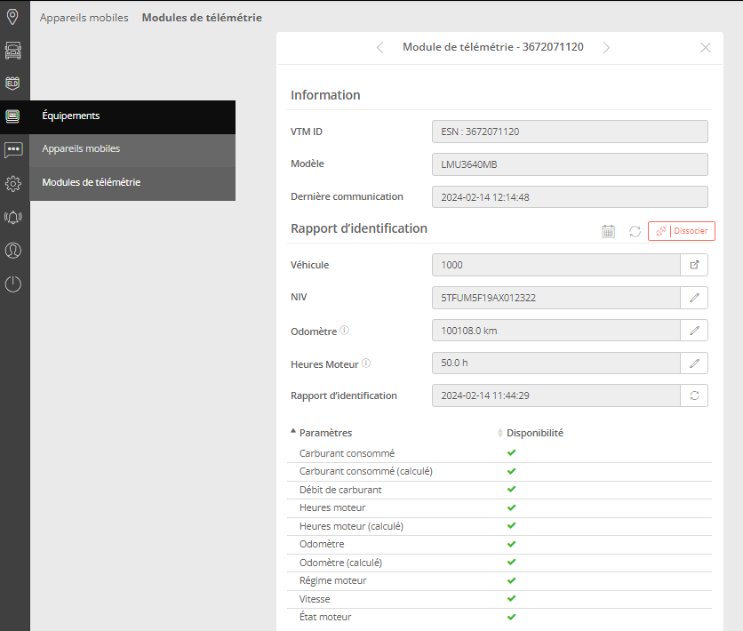 - Naviguer à la page Module de télémétrie sous l'onglet Équipements puis sélectionner le module de télémétrie correspondant au véhicule souhaité.